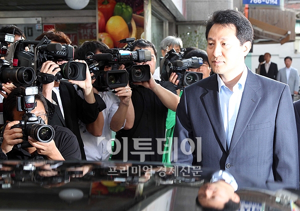 서울시 무상급식 주민투표일인 24일 오전 오세훈 서울시장이 종로구 혜화동 자치회관에 마련된 제2투표소를 찾아 투표한 후 차량으로 이동하고 있다.