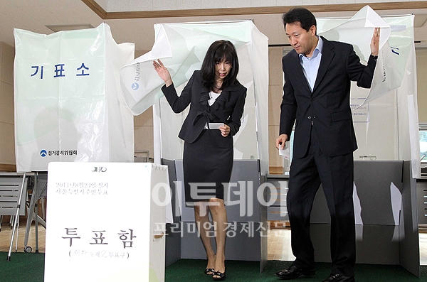 서울시 무상급식 주민투표일인 24일 오전 오세훈 서울시장이 종로구 혜화동 자치회관에 마련된 제2투표소를 찾아 부인 송현옥씨와 기표한 후 기표소를 나오고 있다.