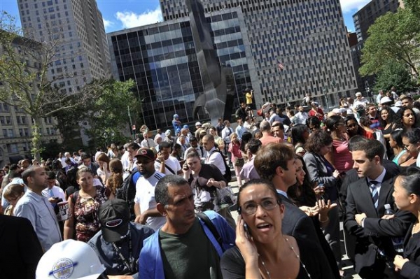 워싱턴을 포함한 미국 동부 지역에서 규모 5.9의 지진이 발생한 23일(현지시간) 뉴욕 시민들이 건물 밖으로 뛰쳐 나와 불안감을 감추지 못하고 있다. 뉴욕/AFP연합뉴스