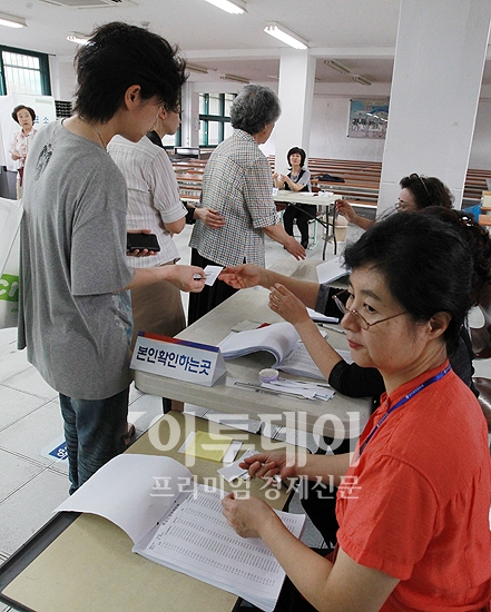 서울시 무상급식 주민투표일인 24일 오전 서울 여의도초등학교에 마련된 투표소에서 시민들이 투표를 하고 있다.