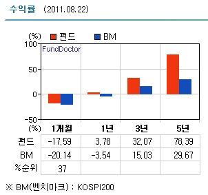 얼핏 보면 투자자들의 구미를 당기는 수준의 수익률은 아니다. 하지만 설정 후 목표한 수익률을 꾸준히 유지한 결과 5년 누적수익률 78.39%(제로인, 2011년8월22일 기준)를 기록하며 수익률 상위 7%에 이름을 올렸다.