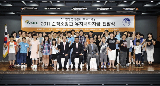 에쓰오일 아흐메드 에이 수베이 CEO(가운데)가 25일 마포구 공덕동 본사에서 화재진압, 긴급구조 활동 중 순직하거나 장애를 얻어 퇴직한 소방관 자녀 100명에게 교육비로 300만원씩, 총 3억원을 전달하고 기념촬영을 하고 있다.