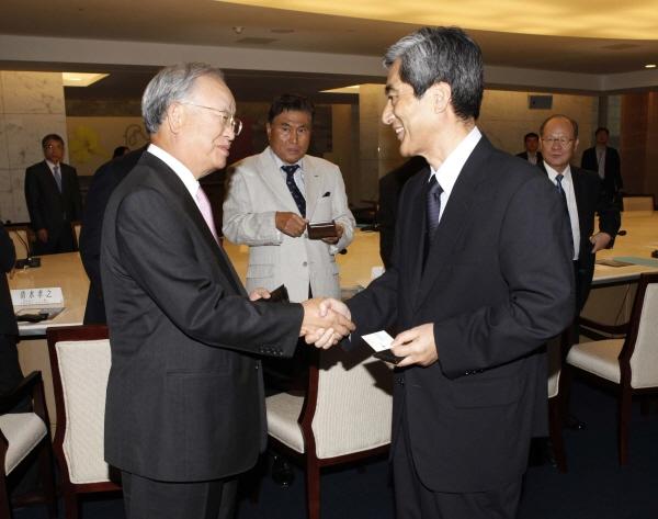손경식 대한상공회의소 회장(왼쪽)은 25일 오후 남대문로 상의회관에서 사쿠라이 토오루 일본 시즈오카상의 부회장을 만나 인사를 나누고 있다. 이날 손 회장과 사쿠라이 부회장은 양국간 경제협력증진 방안을 논의했다.