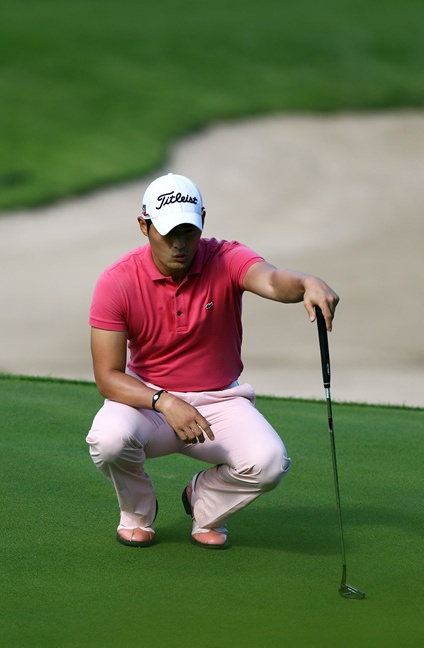 25일 경기도 용인시 아시아나 골프장 동코스(파72·6800야드)에서 열린 제54회 대신증권 KPGA챔피언십 1라운드 대회. 1라운드 6언더파로 공동1위를 기록한 김병준프로가 8번홀에서 퍼팅라인을 살피고 있다.
