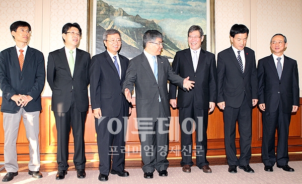 김중수 한국은행 총재가 31일 오전 서울 중구 남대문로 한국은행에서 열린 경제동향간담회 참석자들과 이야기를 나누고 있다.