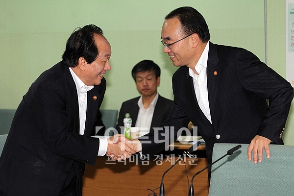 박재완 기획재정부 장관(오른쪽)과 서규용 농림수산식품부 장관이 31일 오전 정부과천청사에서 열린 경제정책조정회의에 참석하며 인사를 나누고 있다.