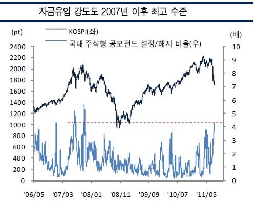 미래에셋증권 이진우 연구원은 31일 “현재 펀드 자금 유입(설정)은 유출(해지)의 4배”라며 “유입 강도가 이 수준을 넘은 것은 ‘펀드 르네상스’였던 2007년 7월과 11월 두 차례밖에 없었다”고 분석했다.