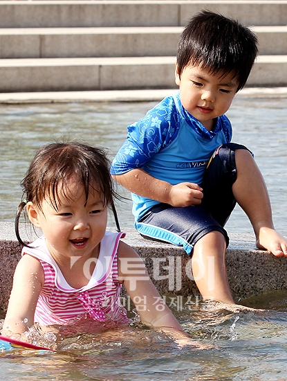 가을이 다가왔지만 한여름같은 무더위가 기승을 부리는 31일 오후 여의도 한강시민공원에서 어린이들이 물놀이를 하고 있다.
