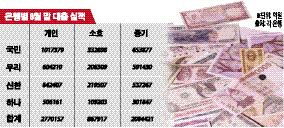 5일 은행권에 따르면 국민·우리·신한·하나은행의 지난달 말 기준 소호로 분류되는 대출잔액은 86조7917억원으로 집계됐다. 이는 같은 기간 이들 은행의 가계대출(277조157억원)의 30%가 넘는 수준. 가계대출에 포함된 개인사업자들의 기업운영자금용 대출금액을 고려한다면 실제 소호대출 규모는 더 늘어날 것으로 추산된다.