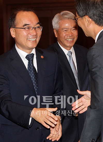 박재완 기획재정부 장관(왼쪽)과 현재현 전경련 경제정책위원장이 5일 오전 서울 소공동 롯데호텔에서 열린 ‘제3차 전경련 경제정책위원회 ’에 참석해 인사를 나누고 있다.