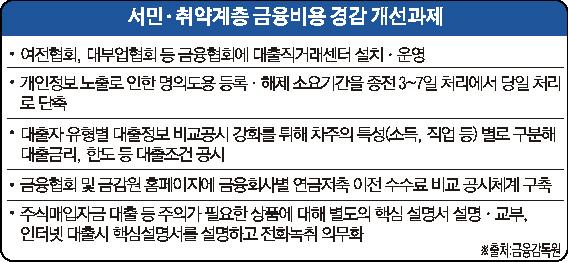 이 외에도 △차주의 소득·직업 등이 반영된 신용등급을 기준으로 구분한 다수의 차입자 유형별로 대출금리, 한도 등 대출조건 공시 △금융협회 및 금감원 홈페이지에 금융회사별 연금저축 이전 수수료 비교 공시체계 구축 등 금리·수수료·대출조건 등의 금융정보 제공을 강화키로 했다.