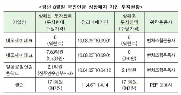 국민연금이 투자한 기업의 상장폐지로 투자액 171억원이 날아갈 위기해 처했다.