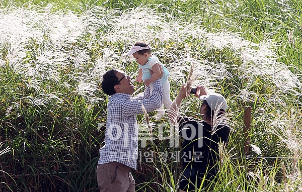 본격적인 가을로 접어든 21일 오후 상암동 하늘공원을 찾은 한 가족이 억새풀 사이에서 사진을 찍으며 가을을 느끼고 있다.