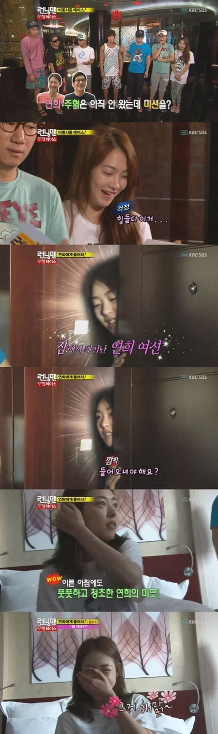 문을 빼꼼히 열고 '런닝맨' 멤버들을 맞은 이연희는 아침임에도 불구, 여신과 같은 미모를 자랑하며 멤버들의 감탄을 자아냈다.