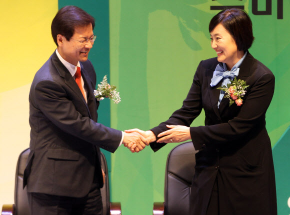 25일 오후 서울 송파구 잠실동 잠실실내체육관에서 벌어진 서울시장 보선 후보자 선출을 위한 민주당 서울시 당원대회가 끝난 뒤 서울시장 보선 후보로 선출된 박 의원과 천정배 의원이 악수를 나누고 있다. (사진 - 연합뉴스)