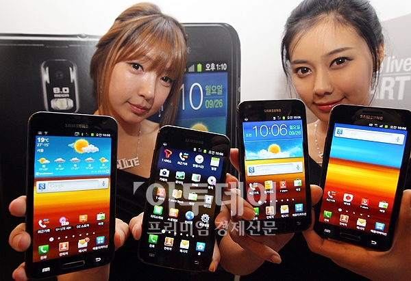 삼성전자는 26일 오전 서초사옥 다목적홀에서 ‘슈퍼 아몰레드 LTE 스마트폰 라인업’ 런칭 행사를 열었다. 모델들이 갤럭시S2 LTE 스마트폰을 들고 포즈를 취하고 있다.