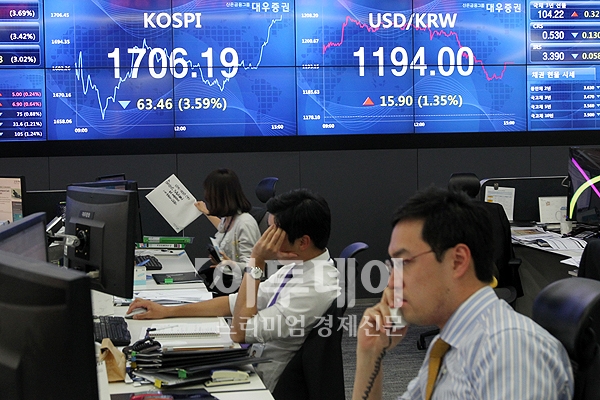 그리스 국가부도 우려로 금융시장의 위기감이 계속되고 있다. 4일 오후 여의도 대우증권 트레이딩 센터에서 코스피 지수가 낙폭을 줄이며 1706.19 로 장을 마쳤다.