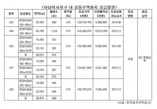한국토지주택공사(LH)가 보금자리 시범지구인 하남미사지구 내 공동주택용지 5개 필지(A22, 23, 27, 30, 32블록), 21만7756㎡를 공급한다고 5일 밝혔다.