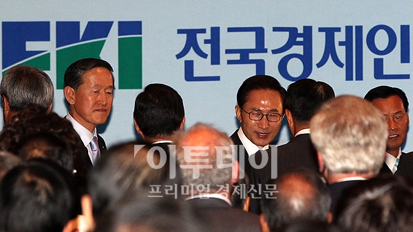 이명박 대통령이 5일 오후 장충동 신라호텔에서 열린 전경련 창립 50주년 기념 리셉션에 참석하며 전경련 회장단과 인사하고 있다.