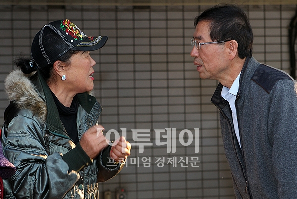 10·26 서울시장 보궐선거 선거운동이 공식적으로 시작된 13일 오전 박원순 서울시장 후보가 남대문시장을 찾아 상인의 눈높이를 맞추며 이야기를 듣고 있다.