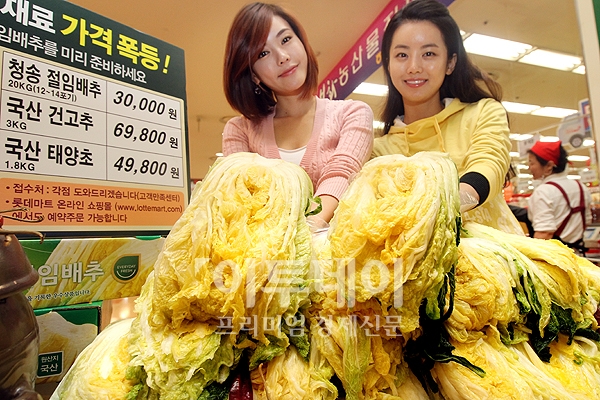 롯데마트는 김장철을 앞두고 13일부터 31일까지 전국 점포와 인터넷 쇼핑몰에서 시세보다 싼 가격의 절임 배추와 건고추를 예약 판매한다. 절임 배추는 시세보다 40~50%, 건고추는 20~30% 싸게 판매하며 예약한 상품은 내달 10일~12월 8일 지정한 날짜에 무료로 배송된다.