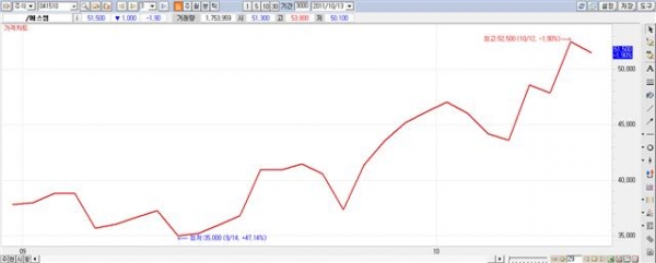 13일 에스엠은 전일대비 1000원(1.90%) 내린 5만1500원으로 장을 마무리했다. 에스엠은 이달 총 8거래일 가운데 3거래일을 제외하고는 내내 하락세를 보였다. 지난달 ‘소녀시대 3집’ 발매와 에스엠 타운(SM Town) 콘서트 개최 기대감에 단 5거래일을 제외하고 내내 상승세를 이어가며 한달만에 22.08%나 급등했던 것과는 대조적이다.