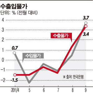9월 수입물가 전월 대비 3.7% 상승, 수출물가도 급등
