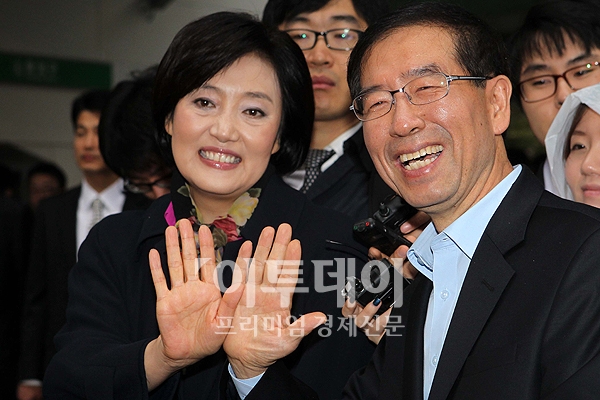 10·26 서울시장 보궐선거 박원순 범야권단일후보가 14일 오전 구로디지털단지역에서 민주당 박영선 의원과 함께 출근길 시민들과 인사를 하고 있다.