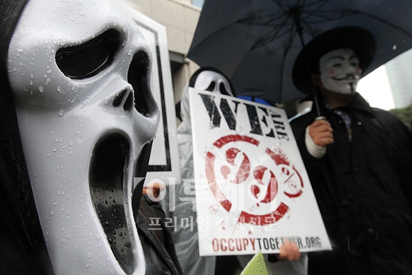 전 세계 80여개국 900개 이상 도시에서 동시에 ‘반(反) 월가’ 시위가 열리고 있는 15일 오후 여의도 금융감독원 앞에서 스크림 가면 등 다양한 가면과 피켓을 든 참가자들이 집회를 벌이고 있다.