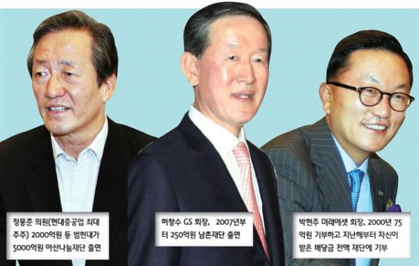 최근에는 재벌 일가들이 사재를 출연하는 과거보다 한 발 나아간 기부행태가 이뤄지고 있다. 정몽준 전 한나라당 대표가 2000억원의 사재를 출연한 것을 중심으로 한 범현대가의 ‘아산나눔재단’이 대표적인 사례이다.
