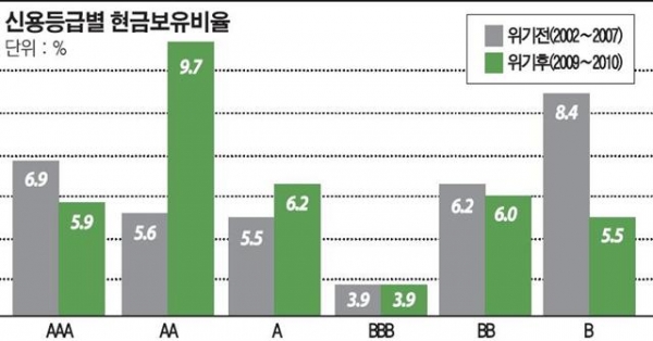이에 대해 전문가들은 기업들이 회사채 및 CP발행을 늘리면 신용등급이 떨어지고 차입 비용이 비싸질 수 있다고 우려의 목소리를 높이고 있다. 실제 2008년 이후 신용등급 AAA인 기업을 포함한 대다수 기업의 현금보유비율이 답보 상태이거나 되려 낮아지고 있다. 한국기업평가에 따르면 신용등급 AAA인 기업의 현금보유비율 중앙값은 금융위기 이후인 2009∼2010년 5.9%로 2002∼2007년보다 0.9%포인트 줄었다. 같은기간 BB등급(0.2%포인트), B등급(5.5%포인트) 역시 상황이 악화됐다.