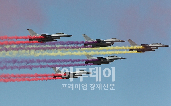 서울 국제 항공우주 및 방위산업 전시회 2011이 17일 프레스 데이를 시작으로 서울공항에서 개막했다. 시범 에어쇼에서 ‘KF-16’이 늠름하게 편대비행을 하고 있다. 비즈니스 데이는 18일부터 21일, 일반관람은 22일부터 23일 까지 계속된다.