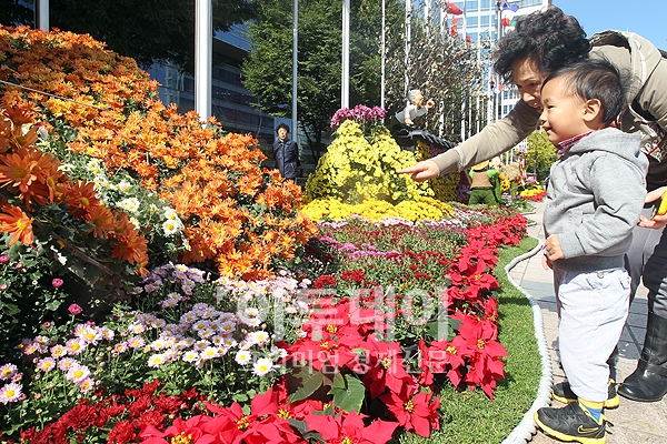 ‘2011 무역센터 국화 페스티벌’ 개막일인 17일 오전 삼성동 코엑스 동측광장을 찾은 할머니와 손자가 형형색색의 국화꽃을 보며 즐거워하고 있다.