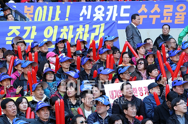 한국음식업중앙회는 18일 오후 88서울올림픽 메인스타디움에서 ‘1018 범외식인 10만인 결의대회’를 개최했다. 참석한 외식업 경영인들이 카드수수료 1.5% 이하 인하, 외국인 근로자 고용정책 개선 등을 촉구하고 있다.
