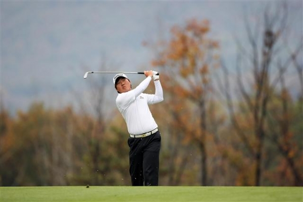 ▲단독선두에 나선 이기상이 세컨드 샷을 하고 있다. 사진 CJ