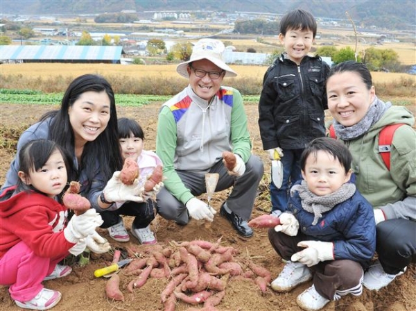 ▲지난 22일 아시아나항공 윤영두 사장(사진 중앙)과 아시아나 임직원 및 가족들이 자매결연을 맺은 강원도 홍천군 외삼포 2리 산초울 마을에서 고구마를 수확하며 즐거워하고 있다.(사진제공=아시아나항공)
