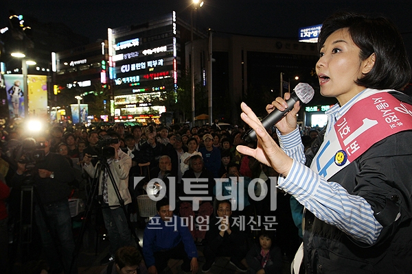 10ㆍ26 서울시장 보궐선거 전 마지막 주말인 23일 저녁 나경원 한나라당 시장후보가 서울 노원역 롯데백화점 앞에서 거리 유세를 펼치고 있다.