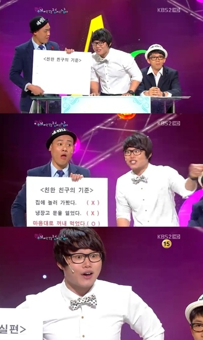 먼저 최효종은 “친구의 집에 가서 냉장고 문을 열고 그냥 꺼내먹으면 친한거다”고 말해 웃음을 자아냈다.
