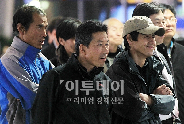 10.26 재보궐 투표가 마무리된 26일 저녁 서울역 대합실의 시민들이 출구조사결과에 집중하고 있다.