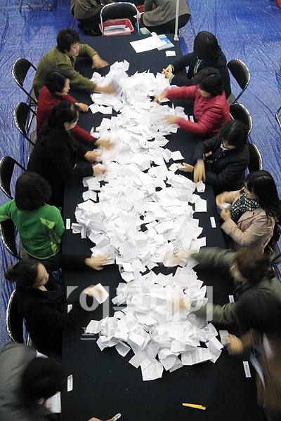 10.26 재보궐선거가 끝난 26일 저녁 영등포 여의도고등학교에 마련된 영등포선관위 개표소에서 선거사무원들이 개표작업을 하고 있다.
