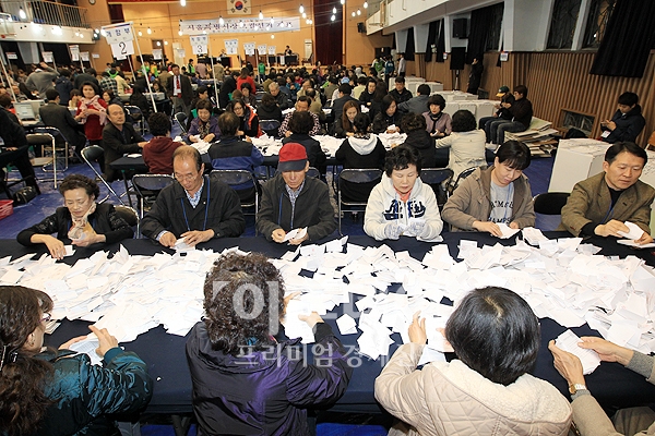10.26 재보궐선거가 끝난 26일 저녁 영등포 여의도고등학교에 마련된 영등포선관위 개표소에서 선거사무원들이 개표작업을 하고 있다.