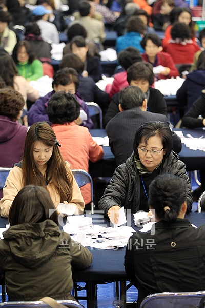 10.26 재보궐선거가 끝난 26일 저녁 영등포 여의도고등학교에 마련된 영등포선관위 개표소에서 선거사무원들이 개표작업을 하고 있다.