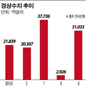 경상수지 흑자는 지난 8월 2억9000만달러를 기록하며 7개월만에 최저치로 떨어졌다. 여름휴가로 조업일수가 감소한 탓에 수출이 줄었기 때문이다. 그러나 지난달 환율 상승과 수입 규모 감소로 다시 30억달러대로 복귀했다.