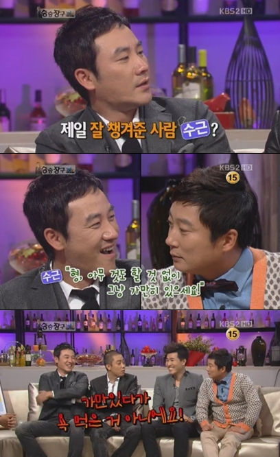 1일 밤 방송된 KBS 2TV '승승장구'에 출연한 엄태웅은 "이수근이 처음에는 말 안하고 가만히만 있어도 된다고 했다"고 말했다.