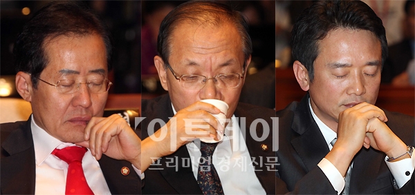 한미 자유무역협정(FTA) 국회 비준안 처리 문제로 여야 간 대치 상태가 계속되고 있는 3일 오후 국회에서 열릴 예정이었던 본회의는 결국 취소되었다. 한나라당 의원총회에 참석한 홍준표 대표(왼쪽부터), 황우여 원내대표, 남경필 외통위원장의 얼굴에서 깊은 고민을 느낄 수 있다.