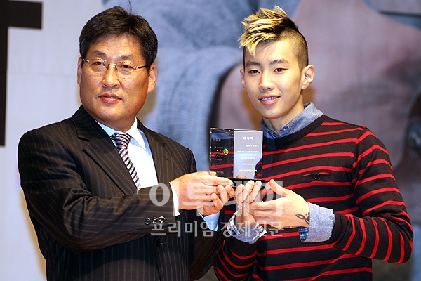 2011 청소년흡연예방캠페인 ‘신분증 확인 동의합니다 ’가 열린 4일 오후 서울 종로구 세종로 올레스퀘어에서 홍보대사로 위촉된 가수 박재범이 이문수 한국담배협회 부회장과 함께 기념촬영을 하고 있다.