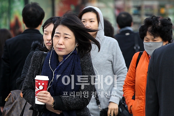 서울의 아침기온이 4도로 급격하게 떨어져 든든한 겨울 외투가 필요한 14일 오전 서울 광화문에서 시민들이 찬바람에 몸을 움츠리며 출근길을 서두르고 있다.