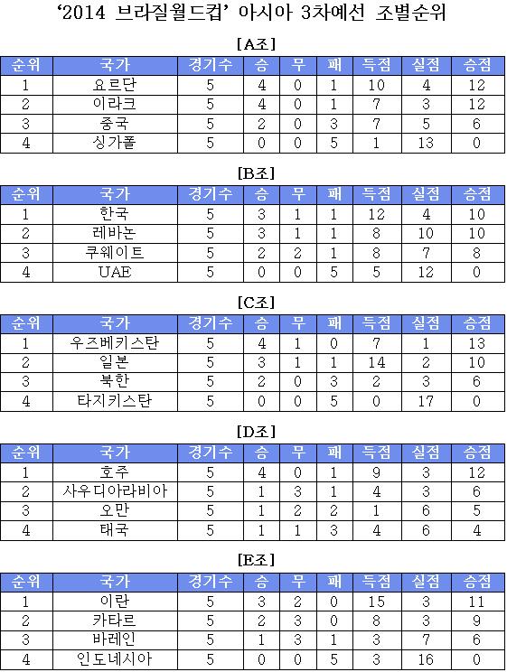 '2014 브라질 월드컵' 아시아 3차예선 조별 순위