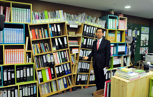 박원순 서울시장의 취임식이 16일 서울시청 서소문별관 시장 집무실에서 온라인 생중계로 열렸다. 박 시장이 취임식 전 집무실을 소개하고 있다.