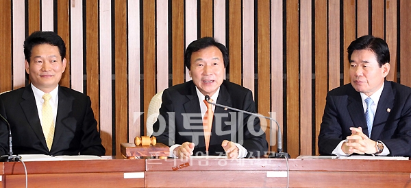 민주당 손학규 대표(가운데)가 21일 오전 국회에서 열린 최고위원-시도지사 연석회의에 참석해 모두발언을 하고 있다.